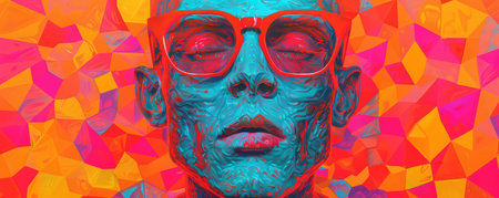 A vibrant and colorful portrait showcasing an artistic interpretation of a figure with striking sunglasses against a bright backdrop.