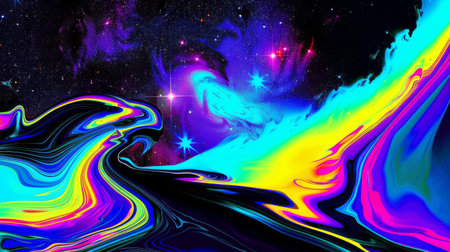 Vivid abstract swirl with iridescent colors and cosmic particles flowing through black marbled liquid dynamic texture background.