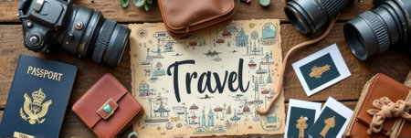 Travel essentials with cameras, passport, and map on rustic table. That the image is generated using AI.