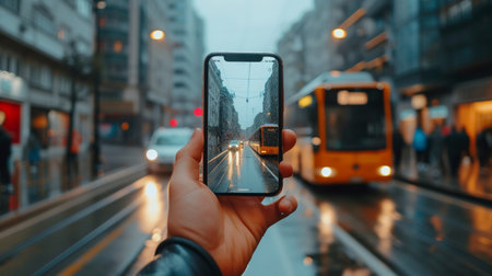 A person holds a smartphone that reflects urban lights and rain-soaked streets. Buses with illuminated fronts create a vibrant atmosphere during a rainy evening..