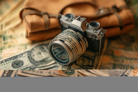 Vintage camera on a pile of US dollar bills with a brown leather case.