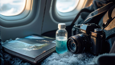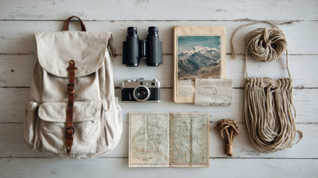 Artistic arrangement of a backpack, hat, camera, book, and map on a table. The visual arts composition includes patterns and textures, creating a unique and aesthetic display AIG50