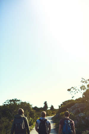 Nothing better than a hike with your buddies. Rearview shot of a group of friends walking along a hiking path together.