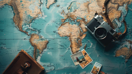 A vintage camera lies on an open world map alongside a passport, creating a perfect setting for travel planning and inspiring future adventures around the globe.