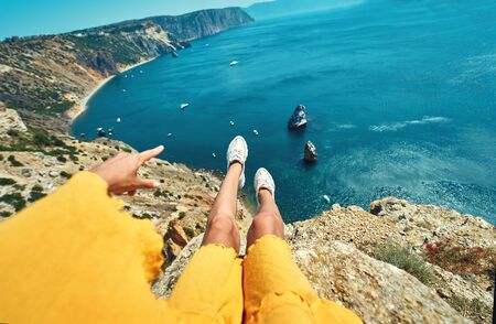 first person view of taned woman in yellow dress sitting on on cliff edge, shows towards the amazing nature view of seascape with high limestone cliff over blue sea and clear deep blue sky. Traveler enjoying recreation time and travel