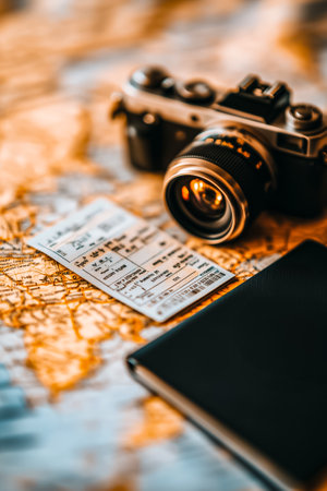 A camera rests on a map alongside airline tickets and a passport, ready for a journey filled with exploration.
