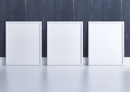 Triple 8x10 Vertical White Frame mockup on white glossy floor and blue rustic wooden wall. Empty picture frame mockup on white glossy floor and blue rustic wooden background. 3D Rendering.