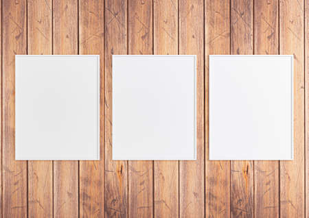 Three frames on wall mockup blank poster. Wooden frames mock up empty print background. Wood picture frames in room. Gallery design realistic modern interior