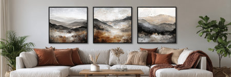 Stylish living room features a cozy sofa with rich cushions, accompanied by three large abstract mountain landscapes that evoke a sense of calm.