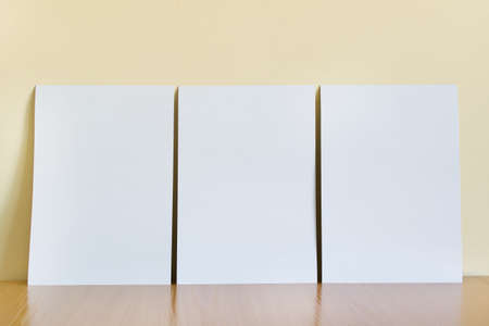 Three white A4 blank paper sheets standing on wooden shelf on the background of yellow wall.