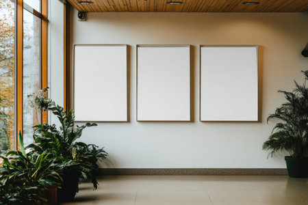 Three empty white picture frames hang on the wall of an office building. The modern architecture features natural light, a wooden ceiling with rectangular-shaped lighting fixtures, windows on one side, and a concrete floor. Green plants in pots add a touch of nature to the space. --ar 3:2 --v 6.1 Job ID: d699b7a6-bd8a-4b7c-b407-aa7be24ac73a