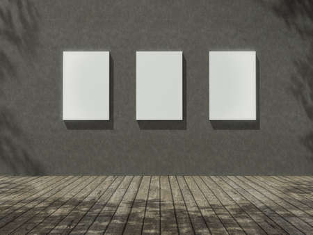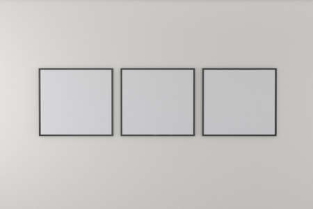 Three blank picture frames on white wall. Mock up, 3D Rendering