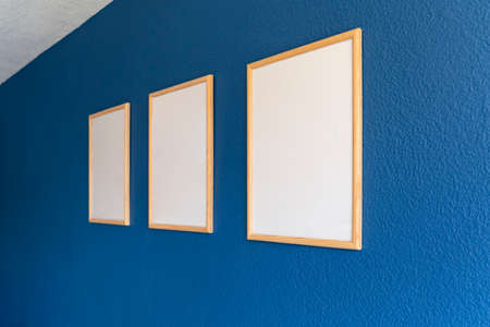 Empty wooden frames, poster white blank canvas mock up on a blue wall, gallery living room template angle view, interior home accent decor