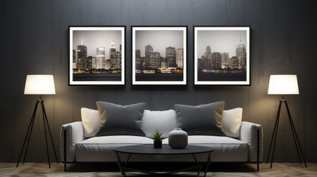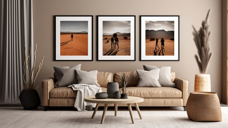 Three large, blank, white picture frames hang on the wall of an elegant living room. The frames have black borders with a thin frame around them, reflecting a minimalistic interior design style. The walls are white, the floor is made of marble, and there is a green plant in the corner and a grey sofa. --ar 3:2 --v 6.1 Job ID: 34951c2d-d7ae-4d2e-b03e-70ac73978b0c
