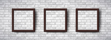 Realistic Square Empty Photo Frames set on grey brick wall. Vector brown wooden picture frame mockup template on grunge brickwall background. Mock up for poster, photo gallery, painting, presentation.