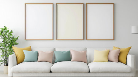 A stylish and minimalist living room featuring a white couch adorned with vibrant cushions. Empty frames on the wall and a green plant enhance the serene atmosphere.