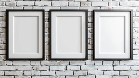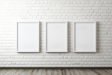Three wooden frames with a pictures or photos on white brick wall in modern minimalistic home interior. Copy space mockup template. Generative AI