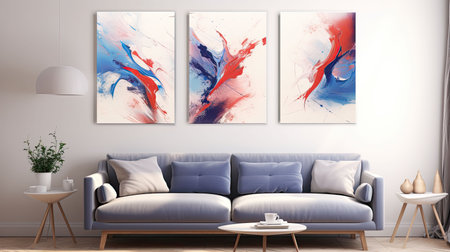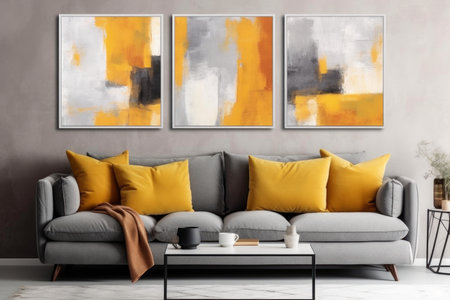 Stylish living room with sofa, colorful throw pillows, and three framed abstract art pieces on wall. Contemporary and inviting space in apartment