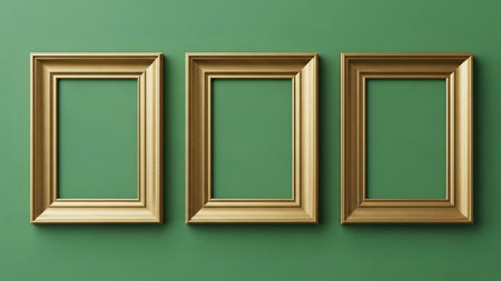 Title: showing title: three empty gold framed rectangular frames on solid green background. resolution use.