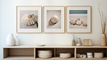 beach framed art featuring a white shelf and glass table. this organic-inspired piece showcases muted tones, wimmelbilder elements, and photorealistic renderings. the light pink and beige hues add a soothing touch. the use of focus stacking technique enhances the details, while the influence of ray eames is evident. the artwork incorporates natural fibers, creating a harmonious and serene atmosphere. ai generated