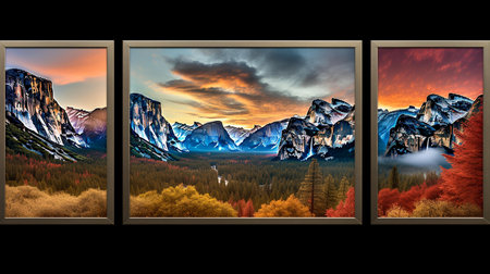 An artful display of diverse seasonal and natural scenes, arranged on a sleek gray backdrop that highlights the vivid colors and tranquil moods through subtle reflection