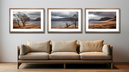 a neutral living room features three large paintings on the wall, depicting mountainous vistas in the style of thomas cole and alex colville. the tranquil landscapes are enhanced with multiple filter effects, creating an isolated and serene atmosphere. the white couch complements the artistic ambiance of the room. ai generated