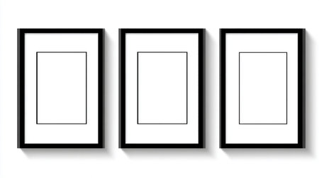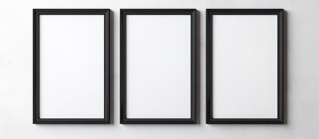 Three rectangular black frames on a symmetrical white wall