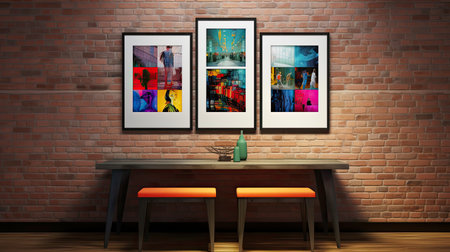 A dining room table with four framed pictures on the wall. Generative AI image.
