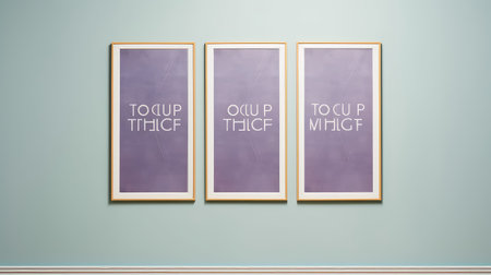 Set of three blank white picture frames on a wall, vector illustration with shadows and soft lighting, minimalist design for an art gallery or photo exhibition presentation template. Isolated on a grey background, flat lay. All focus, brightness, daylight, bright room light, volumetric lighting, photography, f/25, sharp details. --ar 14:5 --v 6.1 Job ID: 130b64e8-776e-4b39-91c6-5e052aab4b7e