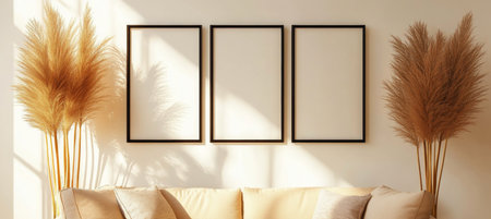 Minimalist Living Room Interior With Blank Frames, Sofa And Dried Flower Decor Under Sunlight.