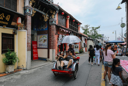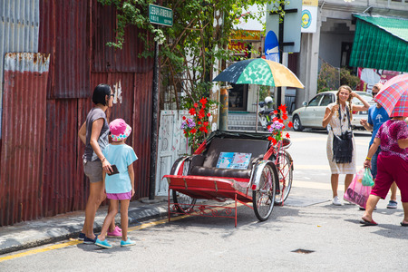 Penang, Malaysia - Mar 10, 2016. People riding rickshaw on street at George Town in Penang, Malaysia. Georgetown is known for its British colonial buildings, Chinese shophouses and mosques.