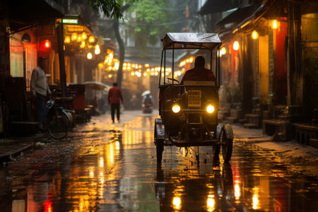 A trisikad driver waits patiently during a sudden tropical downpour, illuminated by the soft, ambient streetlights. Ai-Generated.