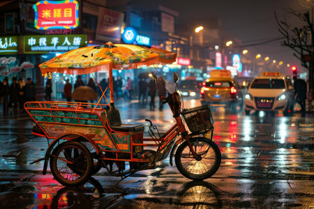 Empty traditional chinese rickshaw is waiting on a rainy night, with the city lights reflecting on the wet street