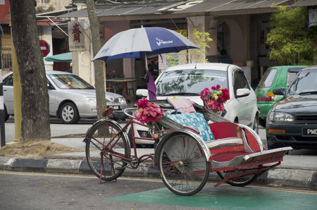 Georgetown, Penang, Malaysia - February 19, 2015: Classic local rickshaw in George Town, Penang, Malaysia.