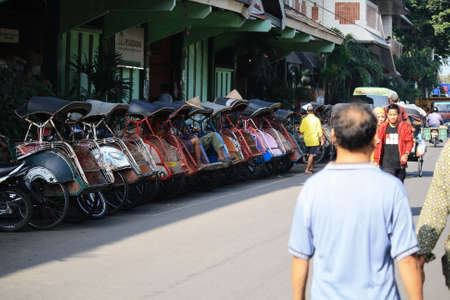 Yogyakarta, Indonesia - April 21 2013. Pedicabs lined up on the outskirts of Yogyakarta road