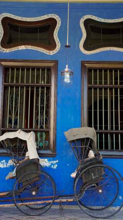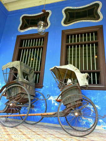 Penang, Malaysia, May 2014: Front picture of the ricksha's at the Blue Mansion (Cheong Fatt Tze Mansion) in Georgetown, Penang.