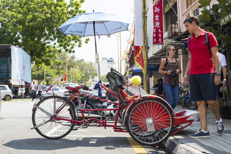 Vintage retro tricycle bike or rickshaw of Malaysian people riding service traveller tour around Georgetown city and street art area on April 26, 2016 in Penang, Malaysia