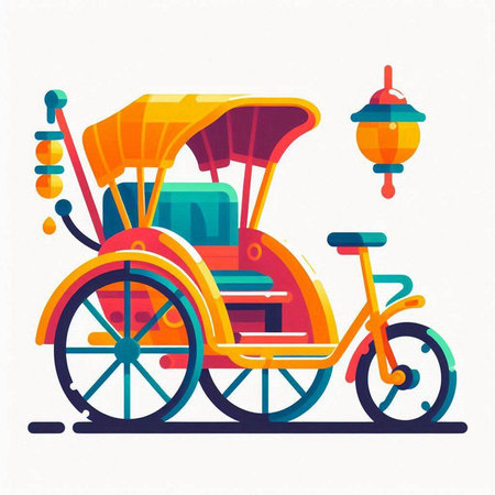 Colorful retro rickshaw with lanterns. Vector illustration.