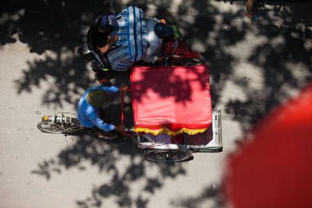 Hanoi, Vietnam - December 19, 2019: Rickshaw driver in the old town.
