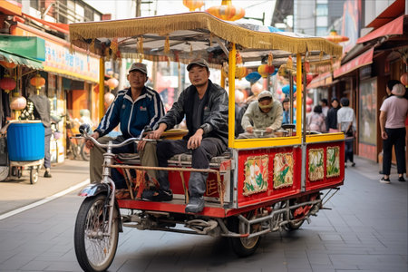 George Town, Penang/Malaysia - Jul 03 2016: Trishaw driver ride at the street. Bread seller read newspaper.