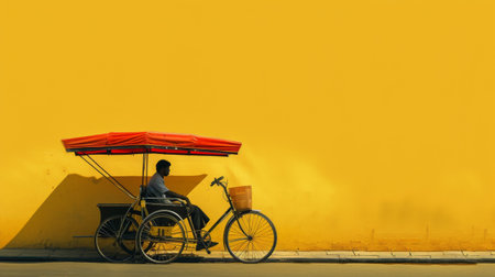 The image features a man riding a three-wheeled bicycle with a red canopy. He is in front of a bright yellow wall with a shadow cast to the left of the frame. The setting appears to be a city street, possibly in Southeast Asia, as the architecture and the use of a three-wheeled bicycle suggest.