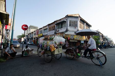 GEORGETOWN, MALAYSIA - JANUARY 19 Trishaw driver waiting for a customers on the street on January 19, 2014 in Georgetown, Malaysia The trishaw ride is a famous attraction for tourists to see the city of Georgetown