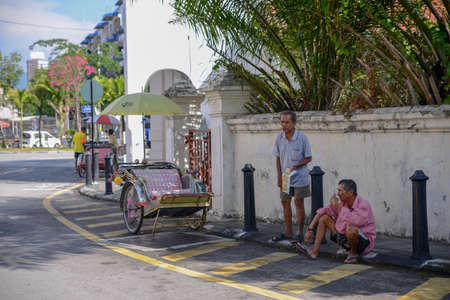 George Town, Penang, Malaysia - November 26, 2017: Rickshaw driver waiting for customer on Georgetown Street.