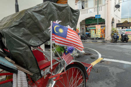 Georgetown, Penang/Malaysia - Sep 25 2020: Malaysia flag is hang on trishaw during Merdeka month.