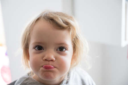 Portrait of a cute blonde girl posing in a kitchen making faces.