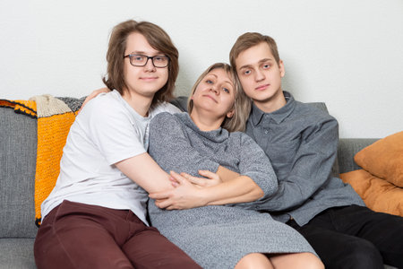 Happy Caucasian Family Get Together Embracing and Sitting on Sofa Indoors With Positive Expression With Mom And Sons. Horizontal Image