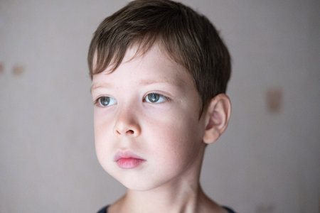 close-up portrait of serious caucasian boy with freckles in casual wear, boy looking in camera