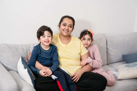 Mother and two kids sitting on sofa smiling and looking at camera. Mixed-race people. Real life, togetherness, diversity