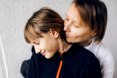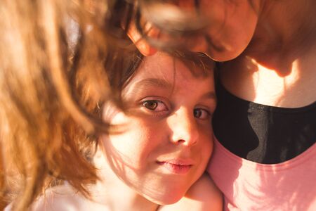 Portrait of a child hugging a mother, a boy spends time with mom, a woman gently hugs her son. Cute boy looks at his beloved mother. Sunset light passing through the hair.