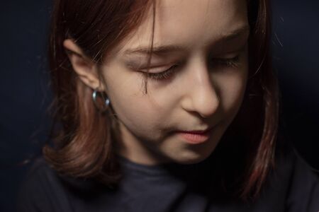 The boy holds a finger at the mouth. Portrait of a boy on a dark background in the studio, one side is lit up by more than another
